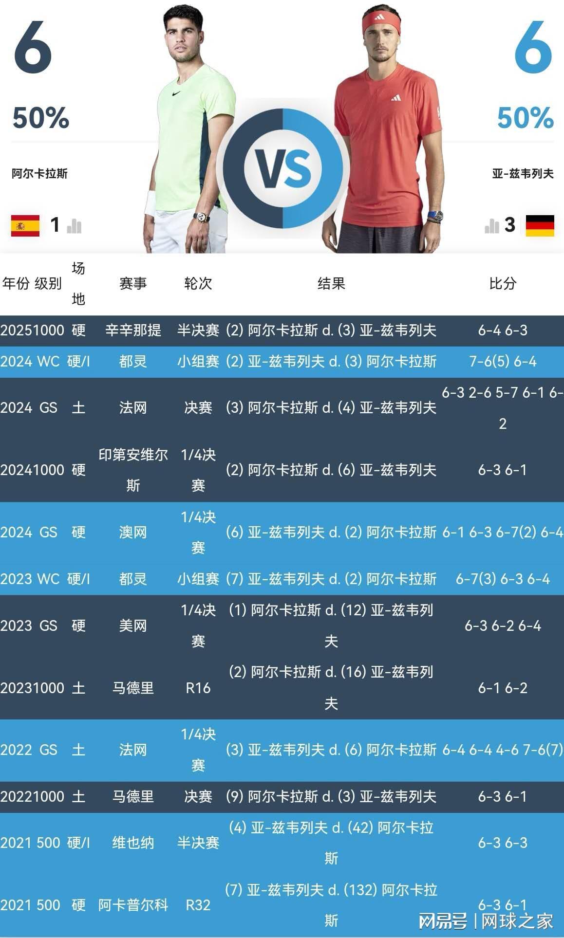 小兹维列夫的底气还在于,职业生涯至今和阿尔卡拉斯交锋12次,各胜六场、平分秋色。大满贯赛场两人四次交锋,同样胜负各半、平分秋色。而且正是在2024年澳网1/4决赛,小兹维列夫四盘击败了职业生涯第一次闯进澳网八强的阿尔卡拉斯。如今2026年澳网半决赛,小兹维列夫理当占据一定的心理优势。