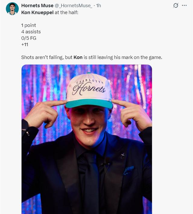 上半场他是5中0,怒砍1分4助攻,正负值+11,黄蜂媒体还表示:虽然得分不佳可还是为我们留下深刻印象。