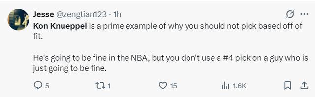 黄蜂球迷:克努佩尔就是一个鲜明的例子,球队根本不该选什么契合度,就算他未来可以立足NBA,黄蜂也不该用4号签去选一个天赋平庸的球员。